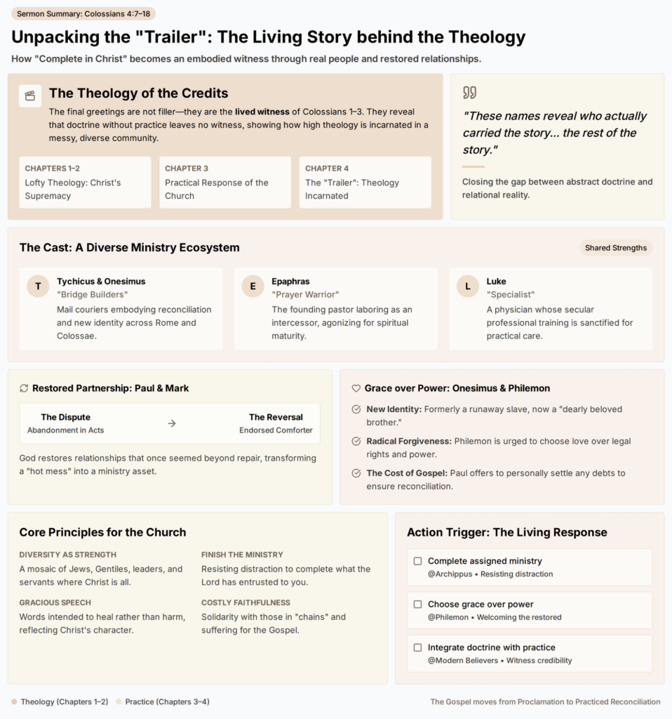 The sermon’s thesis: the final greetings are not filler. They complete the letter’s arc by displaying how “complete in Christ” (Chapters 1–2) becomes lived witness (Chapters 3–4) among real people—people marked by past failures, present faithfulness, and ongoing restoration.